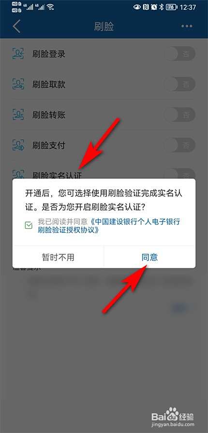 进入刷脸页面,点击刷脸实名认证,点击同意,扫描人脸。
