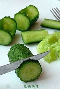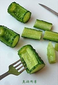 量的将黄瓜的内瓤取的干净一些,只剩下一个外壳回头好能多装些鸡肉汤汁啥的