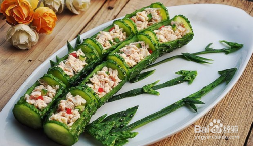 黄瓜盅放入大盘子中摆好,然后再用剪刀将黄瓜皮剪出些竹枝竹叶竹笋,并排摆在黄瓜旁边。随自己所意,觉得怎么好看就怎么摆