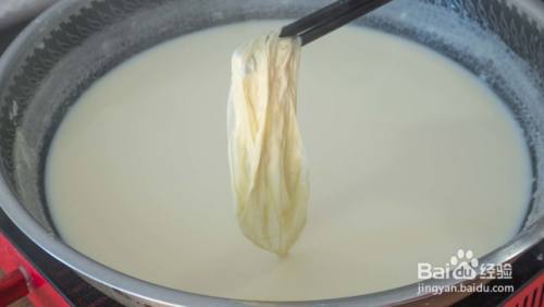 豆浆煮开后转小火继续煮,6分钟左右后豆浆表面会出现一层膜,这个就是腐皮了