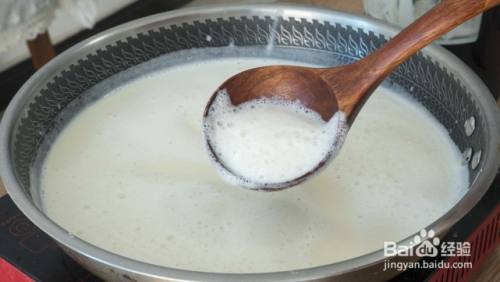 接着开火煮豆浆,煮的时候把豆浆表面的浮沫用勺子舀出来,尽量舀得干净些,不然会影响结皮
