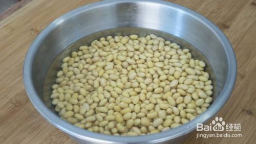 先来泡黄豆,300克黄豆加水提前浸泡一夜,一夜过后豆子都吸足水分,变得鼓鼓的