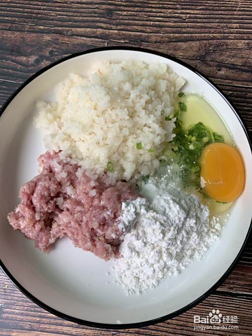 把食材都装在一个大碗里,放入葱花,面粉,淀粉,磕入一个鸡蛋。加一勺生抽,一勺料酒,一勺蚝油,适量黑胡椒粉,半勺盐,沿着一个方向搅拌上劲。