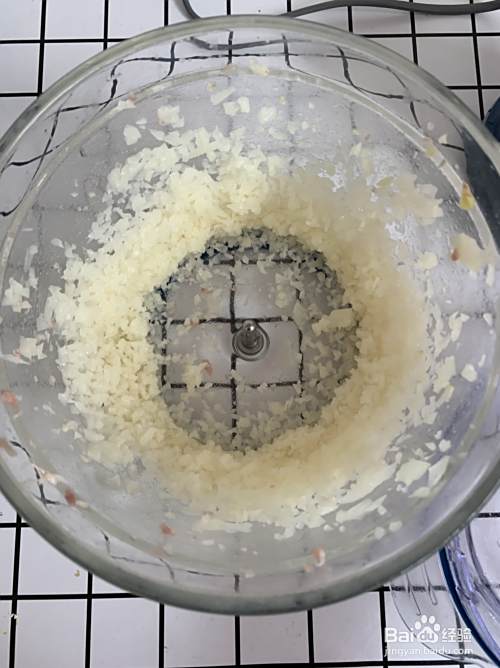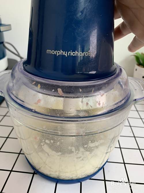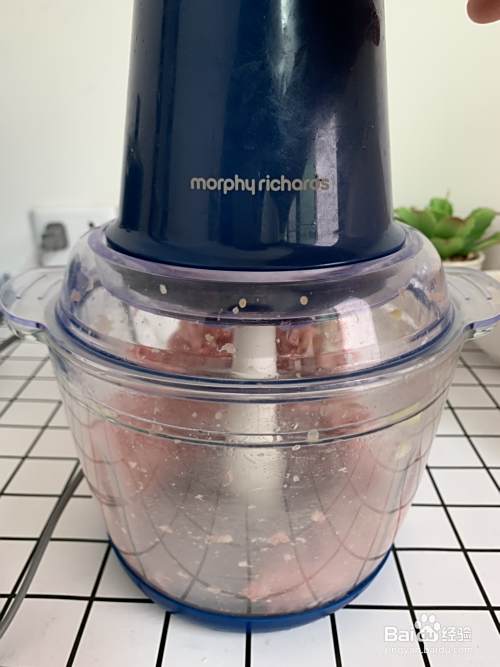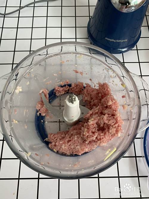 将猪肉切成小块,同时放入大蒜和生姜,放入绞肉机,搅拌成肉酱。