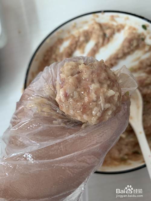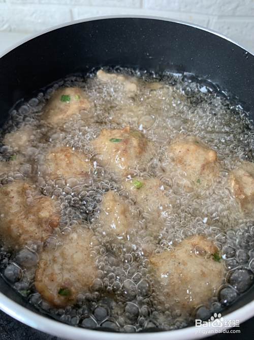 油温烧到六成热,左手虎口挤出丸子,右手用勺子舀进油里炸。