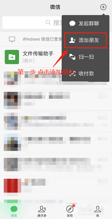 第一步:打开微信侧菊右上角“+”→添加朋友