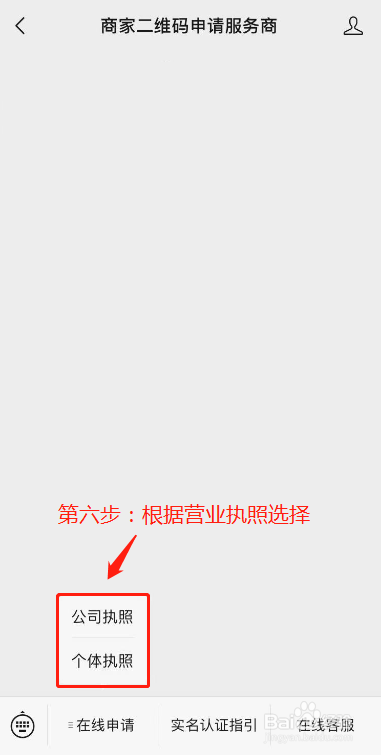 第六步:点击 公众号底部菜单“在线申请”根据营业执照选择填写