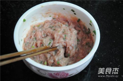 2绞碎的肉末加入葱花、盐、水、生粉,用筷子朝着一个方向拌匀