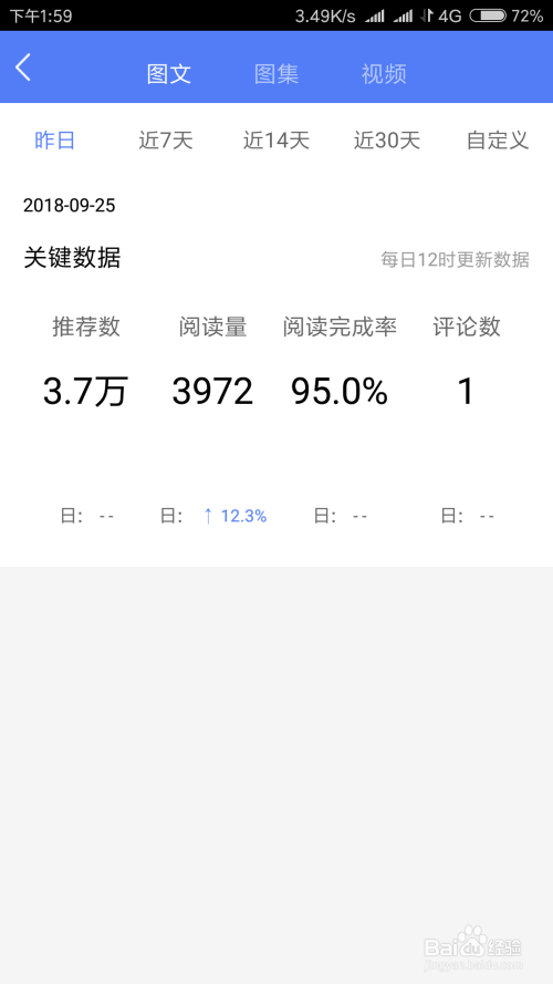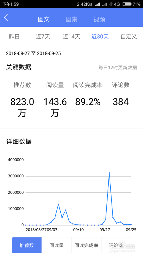 在该界光哄面,场速施我们可以看到阅读量,阅读完成率等参数,还可以查看评论数等。如下图所示。