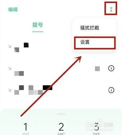 1、打开手机拨号,点击【:】图标,点击【设置】,