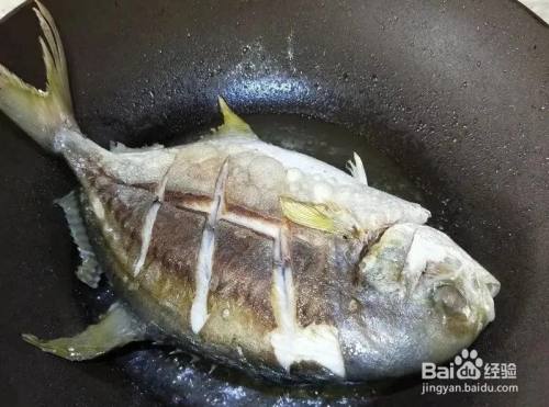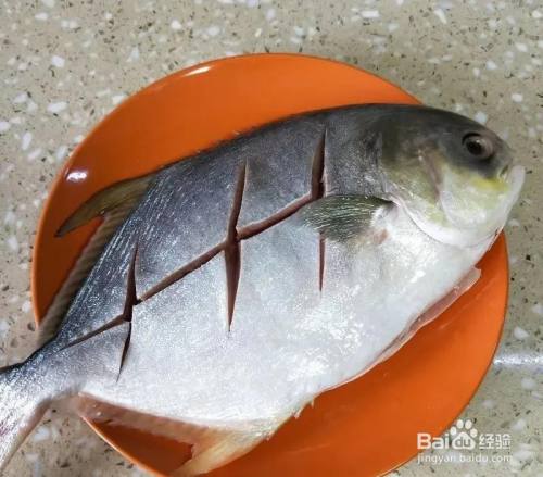 首先将鲳鱼处理干净后, 表面划花刀, 用盐和料酒腌制十分钟。