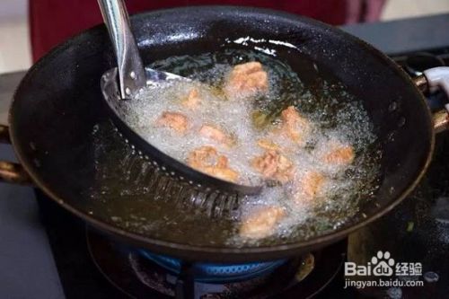 将锅烧热,加入油,油温烧至七成熟,转中小火。加入腌制好的鸡块,中小火慢炸,将鸡肉炸熟,用漏勺把鸡肉捞出来。