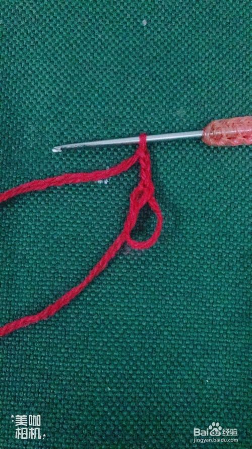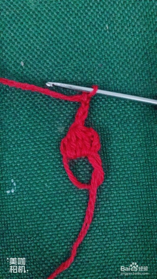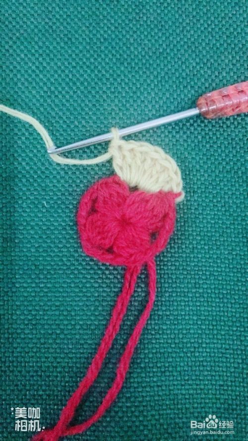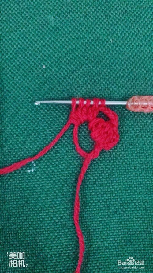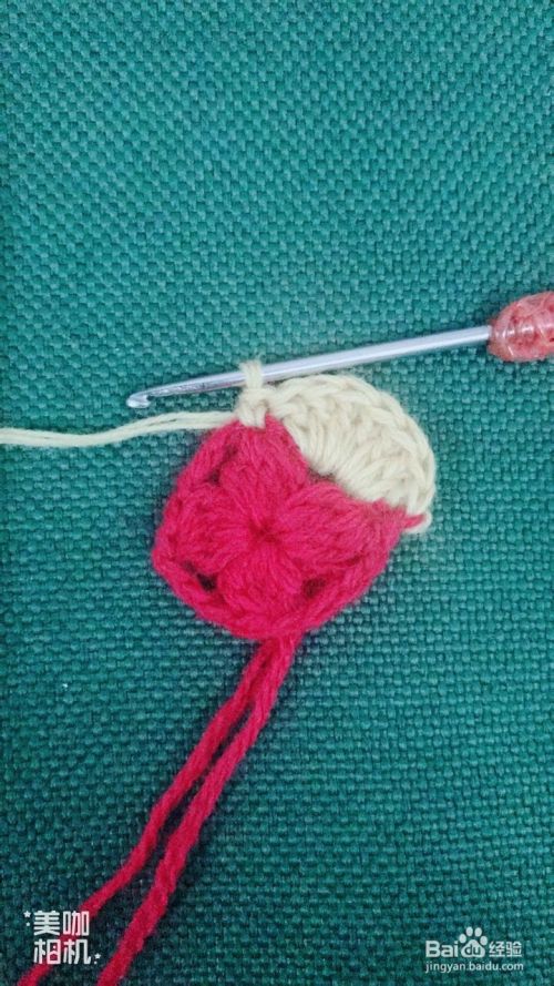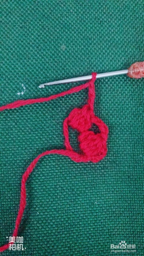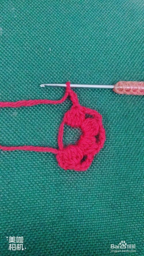 然后在红色花瓣交界处下针,拉花3针,钩中长针4针,紧锁成1针,拉花3针。