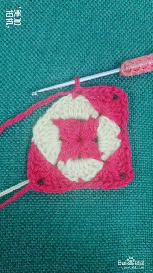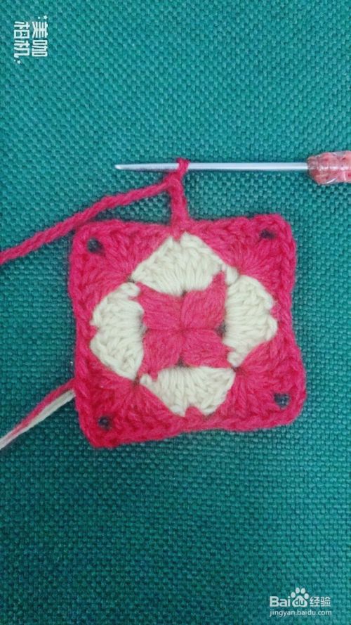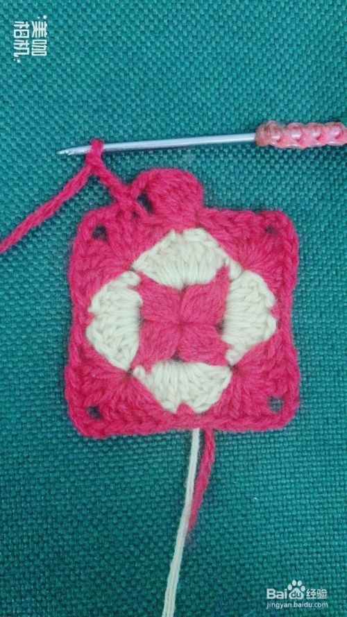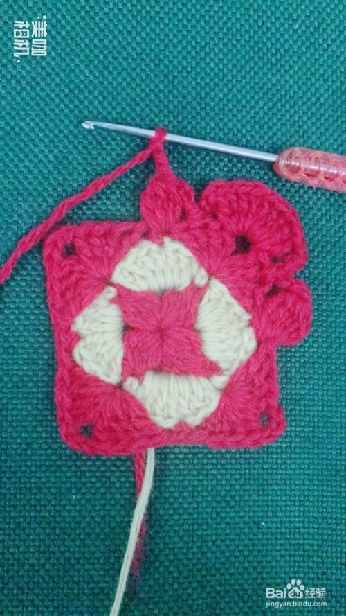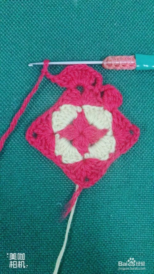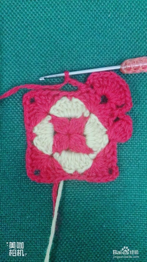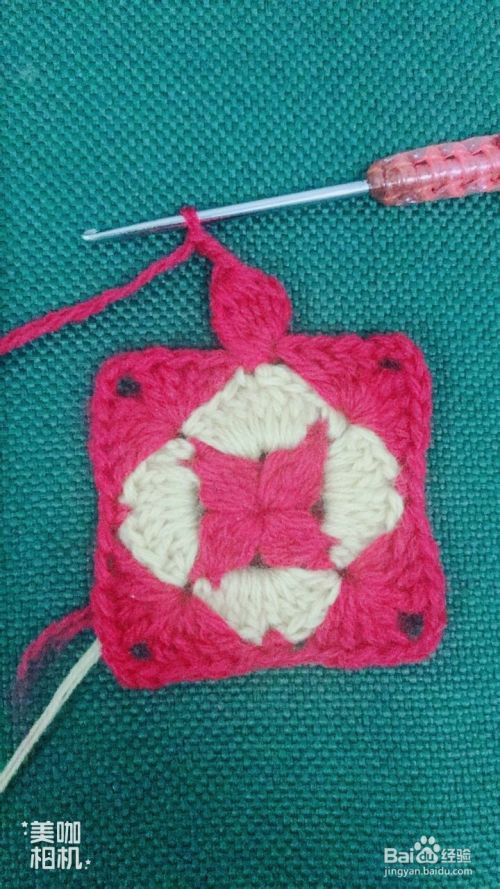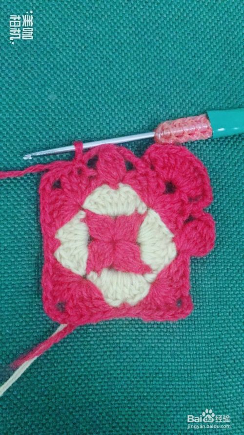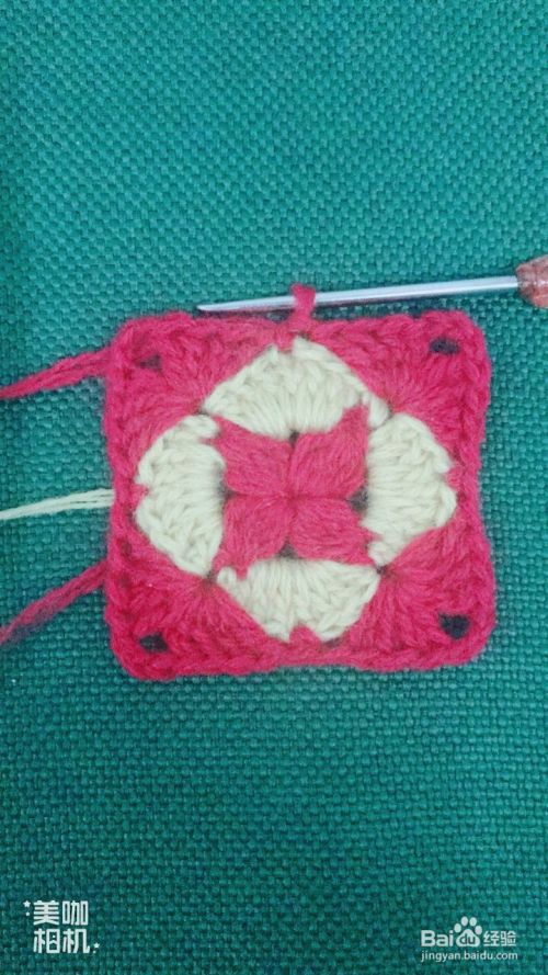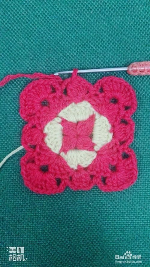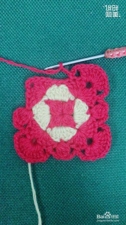 按照第10、11步骤循环钩出4个红色大花瓣。这样钩出一个漂亮的正方形花样了。