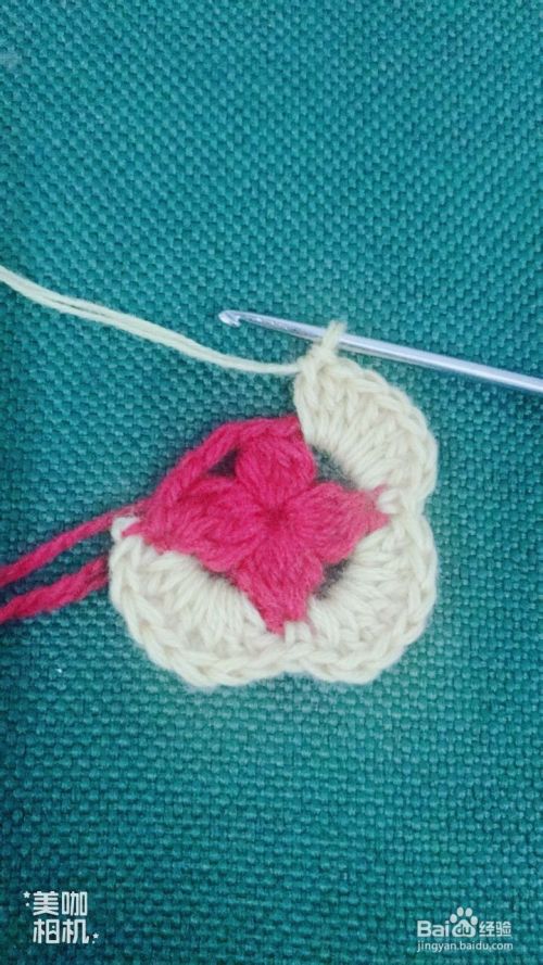 换红色线,在黄色花瓣顶点处起针,在黄色花瓣的交界处下针钩中长针4针,拉花2针。