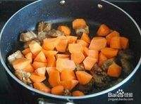 这时,倒入事先清洗切块的胡萝卜块,继续翻炒
