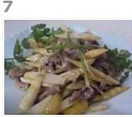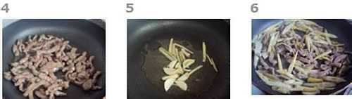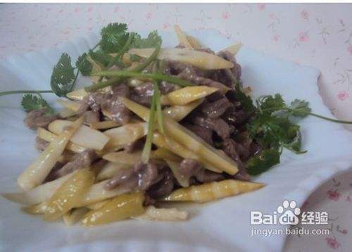 2牛肉斜纹切丝,竹笋切丝,姜、蒜切碎。