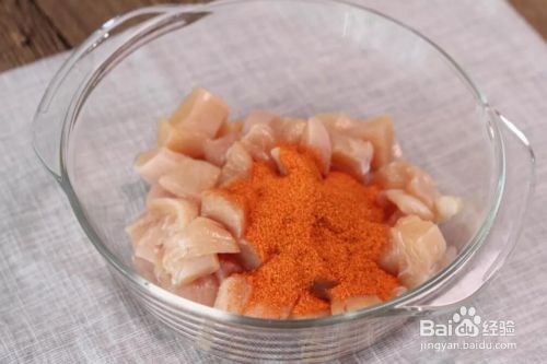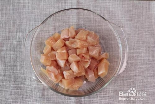 鸡胸肉洗干净,切成均匀的肉丁。