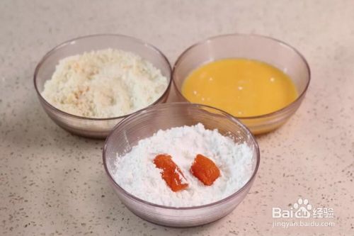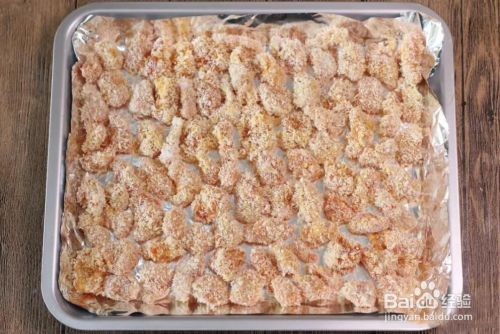 将腌好的鸡丁依次沾上淀粉、全蛋液,再裹上面包糠(加了淀粉的烤出来稍微有点干,也可以选择不加淀粉)。
