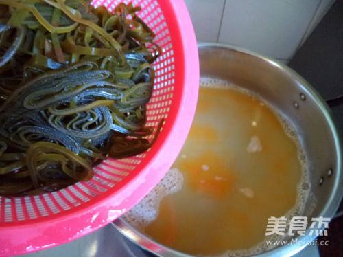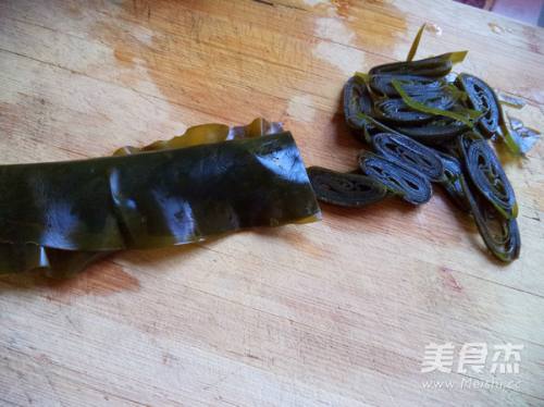 3趁着煮虾头汤的时间,把海带洗净,切丝。(海带切时比较滑手,一定要注意安全,可以把海带卷起来,按紧再切