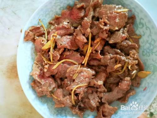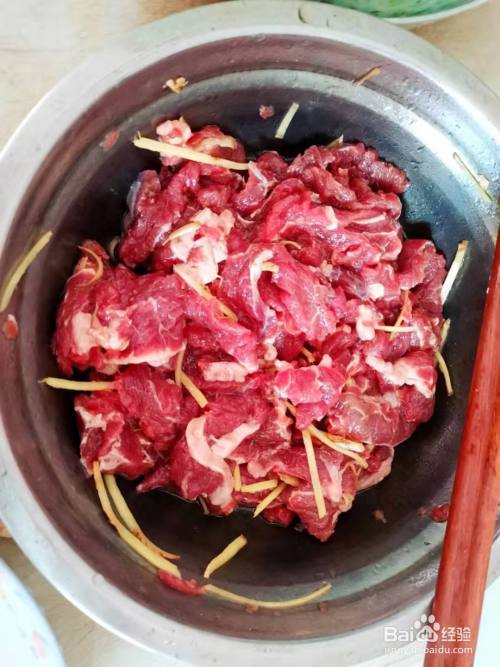 牛肉腌制好,起锅烧油。油微微冒泡,放入姜丝激发出香味后,倒入腌好的牛肉,快速翻炒,直至变色,立即盛起备用。