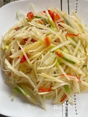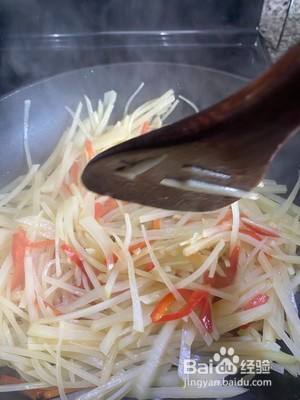 炒土豆丝要全程大火,如果锅干了,就加一点点清水。最后不要勾茨,土豆自己就能产生茨汁。