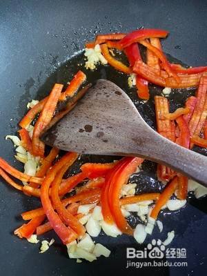 先将红椒丝放到锅里,炒出红色。