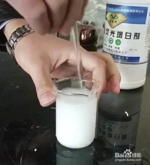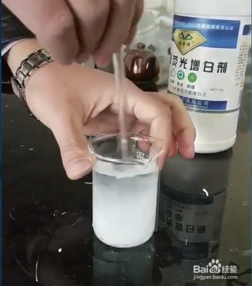 用玻璃棒搅拌,搅拌 3分钟左右,尽量让增白剂和水分散溶解。可以看出把清水都可以变白,