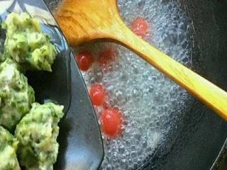 食盐、白糖、小西红柿和清水倒入锅内,大火,煮沸,倒入肉丸,熬至浓稠,倒入香油,搅拌均匀。