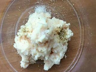 巴沙鱼片清洗干净,剁成肉泥,加入葱姜蒜水、胡椒粉和食盐,搅拌均匀。