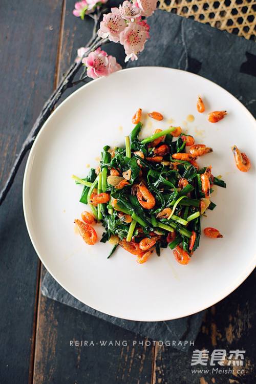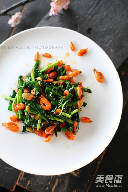 7韭菜略软时,倒入河虾大火翻炒,加盐调味即可出锅。