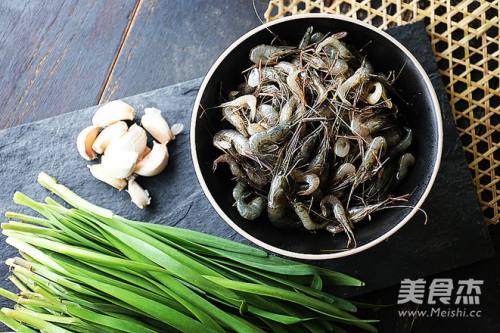 2蒜切片,韭菜洗净切段,河虾剪去虾须洗净沥干,放厨房用纸上吸干多余的水分放置一边备用;