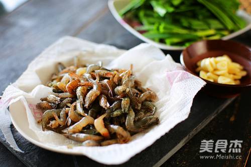 3锅中放入油,烧至七成热,倒入河虾煸至酥脆;