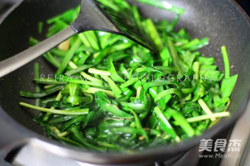 6下韭菜翻炒,加入胡椒粉、酱油、白糖调味;