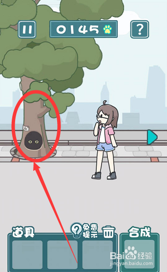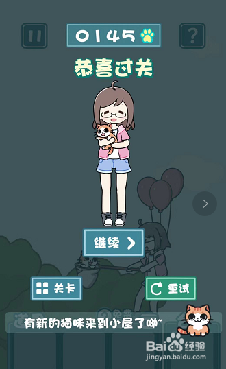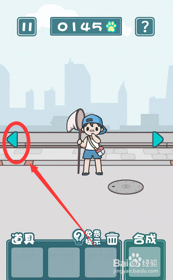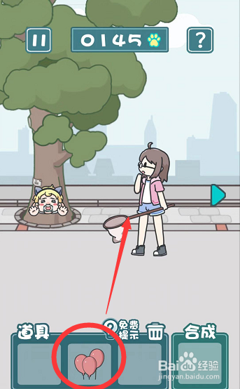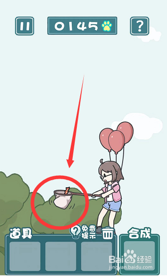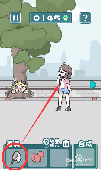 点击向上的图标,点击一下小女孩的网,会出现小猫。点击小猫,就可以过关了。