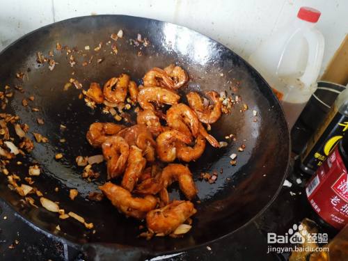 下入提前腌制入味后,经过两遍油温炸制的河虾,在锅中和蒜末一起翻炒