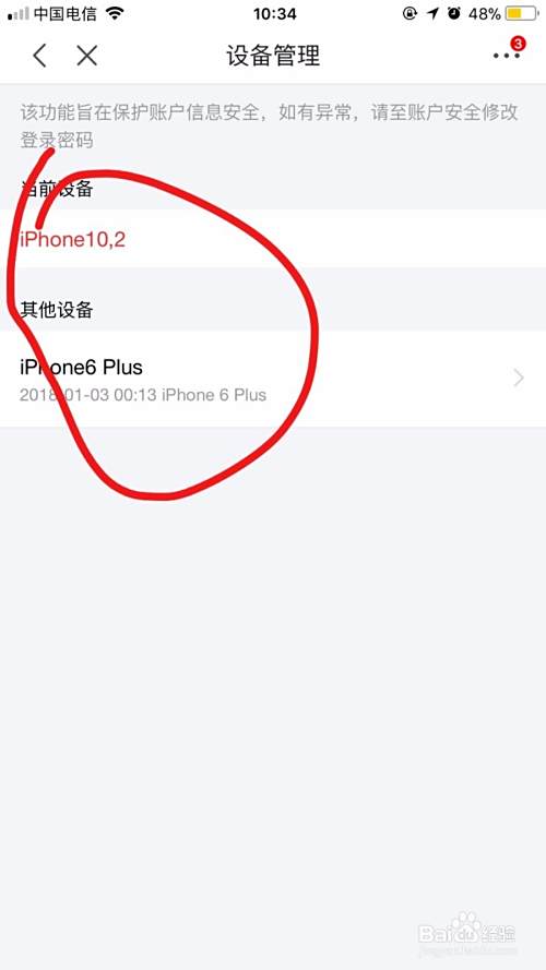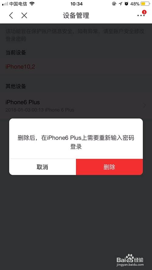在其他设备中选择一个,点击列表项中的设备,弹出删除的提示弹框,提示说如果删除了登录的设备,则再删除的设备上再次进行登录时,就需要重新输入密码登录。如图