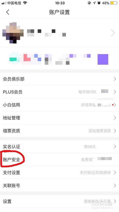 点击“设置”字样进入到“账户设置”界面。在账户设置界面,可以在功能列表中找到“账户安全”功能项。如图