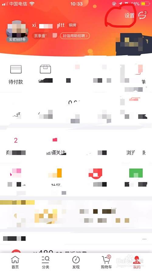在京东app主页的下方的功能项中找到“我的”,并点击进入我的。可以看到我的界面的右上角有“设置”功能字样。如图