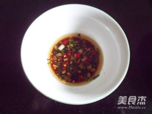 碗中放入生抽,白糖、香醋、味精、蒜水、芝麻油、花椒油、葱花、红椒圈调成料汁。
