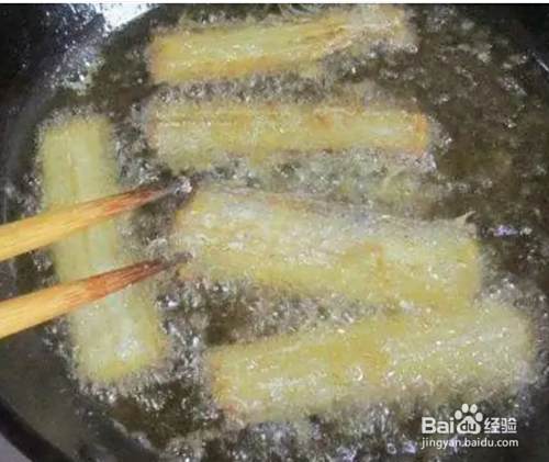 第六步,起锅倒入适量的食用油,油温烧至6成热时,把裹上面包糠的带鱼块下入锅中进行炸制好了以后装盘即可。