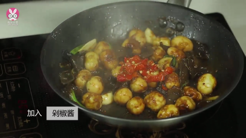 放入鹌鹑蛋、豆瓣酱翻炒均匀。