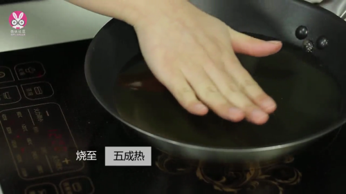锅内倒油烧至五成热。