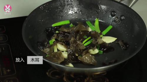 放入木耳继续翻炒。
