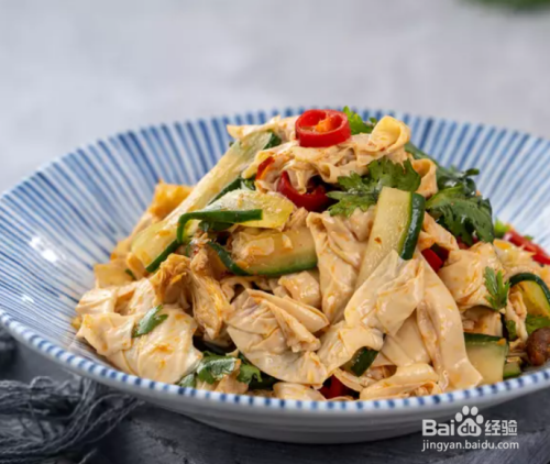 将豆皮、小黄瓜、香菜、辣椒与调味料拌匀即可食用