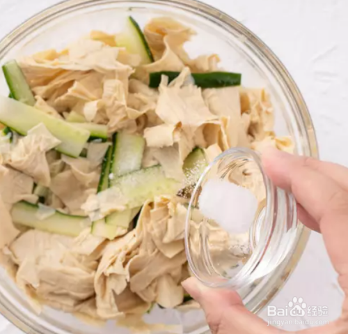 再将小黄瓜放入,撒入盐拌匀后静置5 分钟,让小黄瓜去生、豆皮去除多余的水分