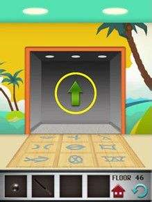 第四十六关比较简单,电梯门上有九个符号,地上也有九个符号,不过方向不一样,只需要调整门上符号的方向,使其与地上的倒影成镜像效果即可打开电梯门。