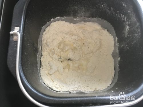 将牛奶,植物油,盐,糖,奶粉,面粉,酵母等材料先后倒入面包机桶里。