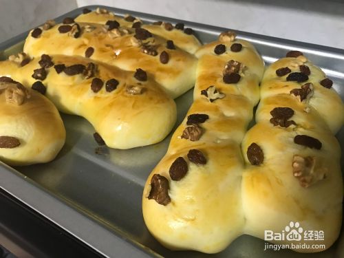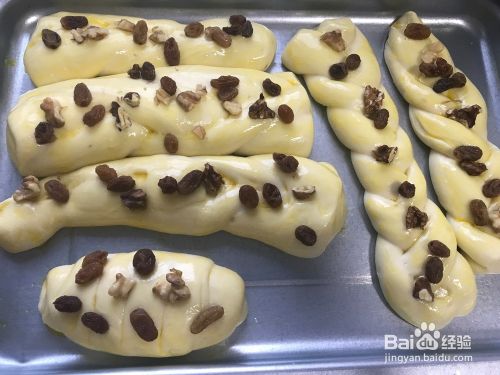 放入烤箱,加一碗热水在里面,继续发酵。然后刷上鸡蛋液,撒上葡萄干或者芝麻。