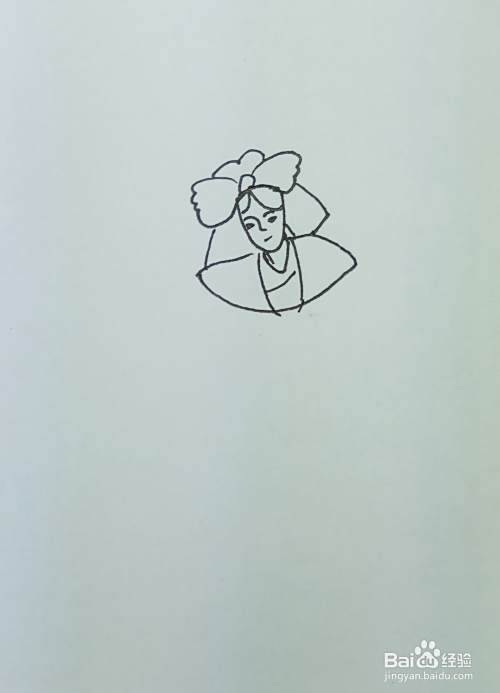 在白纸上用线条和曲线画出小姑娘的头部轮廓,并画出小姑娘的五官和头发,然后再画出她的肩膀部分。